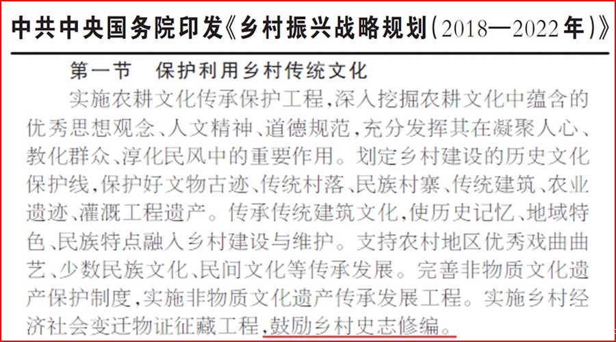 据新华社北京9月26日电,近日,中共中央、国务院印发了《乡村振兴战略规划(2018—2022年)》(以下简称《规划》),并发出通知,要求各地区各部门结合实际认真贯彻落实。《规划》第二十三章“弘扬中华优秀传统文化”中明确“鼓励乡村史志修编”。